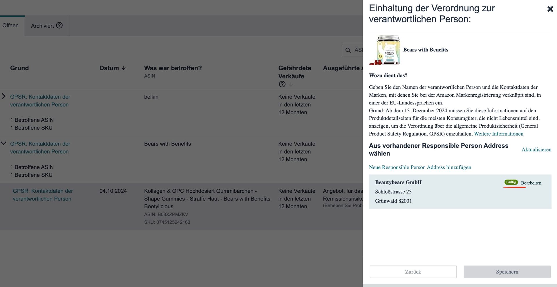 Bei den Kontaktinformationen einfach unter Artikel → Produkt-Compliance verwalten. Dort sind alle ASINs aufgelistet mit Feldern direkt zum Ausfüllen und Abschicken. Wenn dort "Gültig" steht, wie im Screenshot, dann passt es. Nicht wundern, das geht nicht immer aus der Übersicht weg, aber es passt. Leider ist alles etwas verbuggt. Wenn ihr viele SKUS habt einfach die Katalogdatei herunterladen da ist es auch mittlerweile zu finden